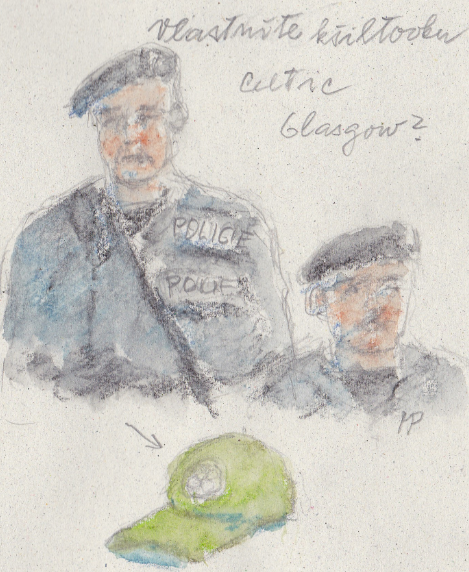 „Tak moment,“ řekne ten větší „máme záznam z kamery, který vás usvědčuje. Měl jste tehdy na hlavě tu kšiltovku Celtic Glasgow.“