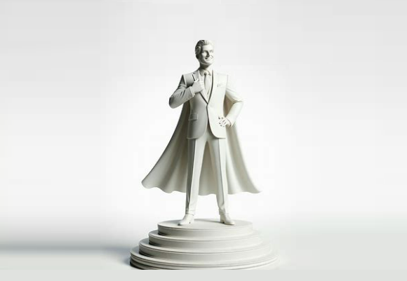 Také toto se povedlo na první pokus. Zadání: Muž hrdě stojí na vyvýšeném stupni, bílé pozadí.