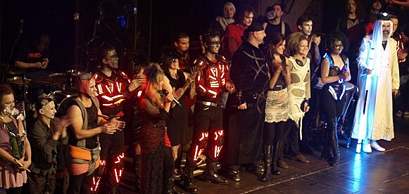 Pro ty, kteří jsou dnes v rockovém divadle poprvé, přichází první nezapomenutelný zážitek ještě před začátkem představení. Do divadelního sálu je třeba sejít nejprve o patro níže, kde po několika metrech ústí chodba u schodiště, tentokrát opět směrem vzhůru. Už sám pohled na kruhové hlediště plné diváků sedících na vyvýšených sedadlech tak, že během představení všichni uvidí děj a nikoliv pouze hlavy sedících před nimi, je jedinečný. Prostor, kde se vše dnešní večer odehrává, je natolik originální a jedinečný, dýchá z něj svůj vlastní život a určitá záruka toho, že to, co se zde odehraje, prostě nemůže být jen obyčejné divadelní představení. Každý, kdo sem dnes přišel, ať již poprvé nebo je zde stálým návštěvníkem, nemohl snad ani předpokládat, že jde jen do divadla. Tuto domněnku potvrzuje i fakt, že v hledišti nesedí snad nikdo ve svátečním obleku. Naopak, je zde vidět běžné neformální oblečení, ale i mnoho cvoček, bot na vysoké platformě, roztrhaných podkolenek, kožených bund i účesů všeho druhu. Přesně to, co se v těchto prostorách vyjímá naprosto přirozeně, přesně to, co by jinde v divadle neuspělo.