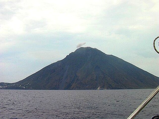 Dalším místem, v Česku moc dobře známým, je pravidelný kužel ostrova Stromboli, sopka vystupující z moře. Na jejím úpatí leží i stejnojmenné městečko, takže Stromboli je současně město, sopka, ostrov i hudební skupina. Známé jsou zdejší černé pláže s úlomky obsidiánu – sopečného skla. Sopka pravidelně co pár minut chrlí minierupce, za dne je z nich vidět jen stoupající sloup dýmu, ovšem po setmění nastává ohnivé divadlo. Prý. My jsme měli smůlu: sopka tři měsíce před našim příjezdem vypustila do moře mohutný lávový proud a přestala chrlit. To byl pro stálé obyvatele signál k opuštění ostrova, protože nic není u sopky horšího, než když se začne chovat neobvykle. Takže jsme se jen okoupali na černé pláži, dali si výbornou granitu (ochucenou ledovou tříšť – kam se hrabe zmrzlina) a obepluli kolem ostrova, abychom si prohlédli známé lávové splazy.