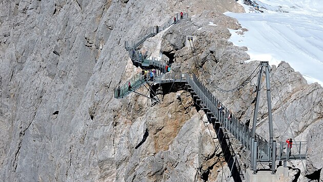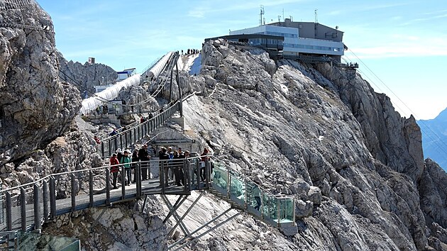 Horní stanice zabrala špičku jednoho z vrcholků dachsteinského masivu, je celá obkroužena železným chodníkem a nad údolí z ní odvážně až drze vyčnívá vyhlídková plošina s proskleným dnem. Z druhé strany si dáváme v bufetu koblihu (a nevíme, zda se smát či plakat nad místní ryčnou kutálkou, která nám k tomu vyhrává tyrolské dechovky, před nimiž není úniku).