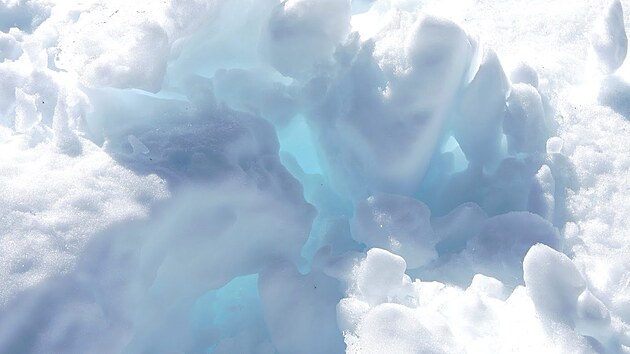 Podzimní období nám umožnilo zažít ledovec asi v nejideálnější kombinaci. Před dvěma dny zapadal čerstvým sněhem, takže je jiskřivě (sněho)bílý, přitom teplo umožňuje chodit v tričku s krátkým rukávem. Tím nechci říct, že bychom teplejší mikinu a podzimní bundu vůbec nevyužili - ve stínu přišlo obojí vhod, ale na sluníčku při namáhavé cestě rozbředlým sněhem do prudkého kopce jsme se postupně odhalovali.