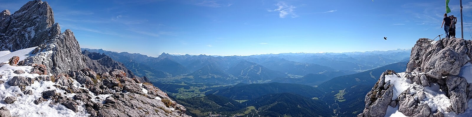 Výhledy po celou cestu jsou naprosto neuvěřitelné. Člověk se nějak nemůže zbavit té homolkovské hlášky, která se mu dere na mysl, ať chce nebo ne: "Ach, ta panoramata!". A chata pod vrcholem třítisícového Dachsteinu to korunuje. Mohutnou téměř svislou jižní stěnou Dachsteinu vystoupal po ferratě nebo horolezecké cestě mladý Čech v plné výbavě a je tím pohledem úplně fascinovaný, hystericky křičí na kolegy pod sebou: "Dělejte, to je nádhera, to jste ještě neviděli!". Asi po několikahodinovém pohledu do kamenné stěny je pro něj pohled na ledovec mezi okolními štíty ještě překvapivější, než pro nás pohodlné, co jsme použili lanovku.