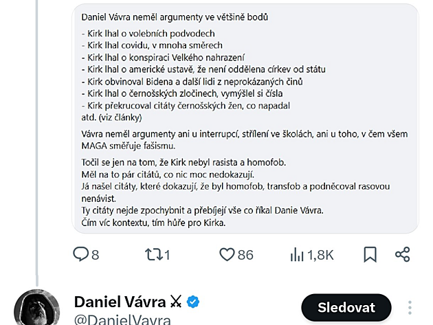 - Vávra to nezpochybňuje a v reakci na ale oponuje, že liberálové a demoratičtí prezidenti mohou za nízkou porodnost, a že konzevativní hodnoty stojící na vysokém počtu dětí proto nejsou zastaralé a naopak to mají všechno zachránit. Následně na to pak odbíhá k tématu migrace, k Muskovi a útočí na humanitní obory na školách.