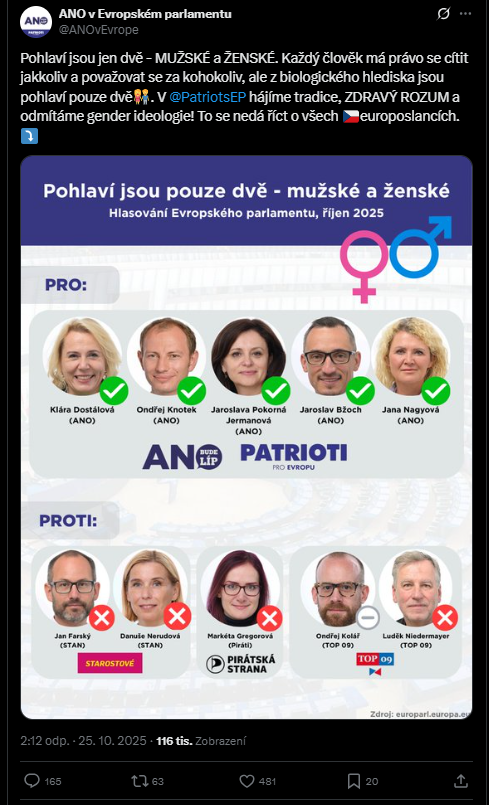 Hnutí ANO převzalo boj nacikonzervativců Fica, Orbána a Trumpa proti biologické vědě a medicíně. Veřejně odmítlo existenci intersexuálních osob, přičemž taková biologická fakta nazvalo genderovou ideologií. Tím vlastně i dokázalo, že si plete pojmy s dojmy a směšuje tak gender s pohlavím. Pohlaví je biologie. Gender je pojem ze sociologie - řeší role, předsudky a sociální postavení. A genderová idientita je věcí neurovědy, psychiatrie a psychologie.