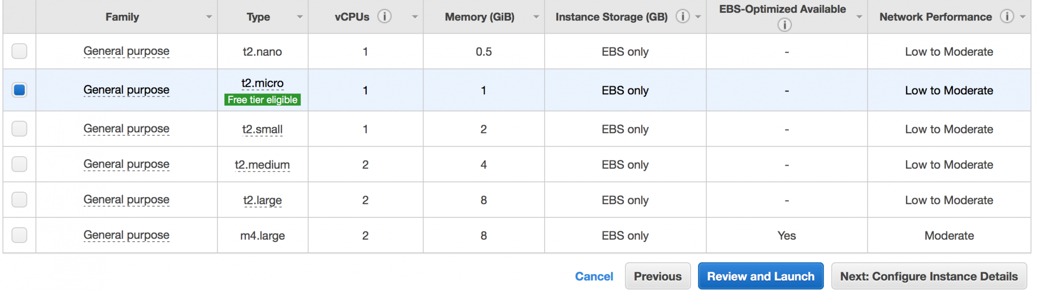 Vyberte instanci t2.micro, možná bude fungovat i t2.nano, klikněte na Review and Launch: