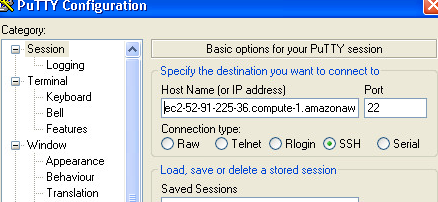 Připojte se uživatelským jménem ubuntu - vyjeďte vlevo úplně nahoře, vyberte Session, do políčka "Host name" vyplňte opsané jméno instance. Klikněte na tlačítko Open: