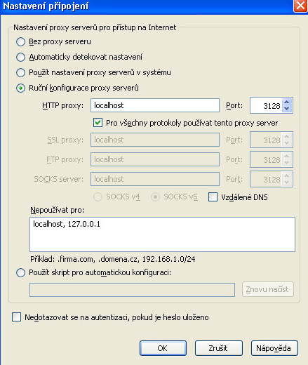 Vyberte "Ruční nastavení proxy serverů", do políčka http proxy vyplňte 127.0.0.1, port nastavte na 3128 a zaškrtněte "Pro všechny protokoly používat tento proxy server".