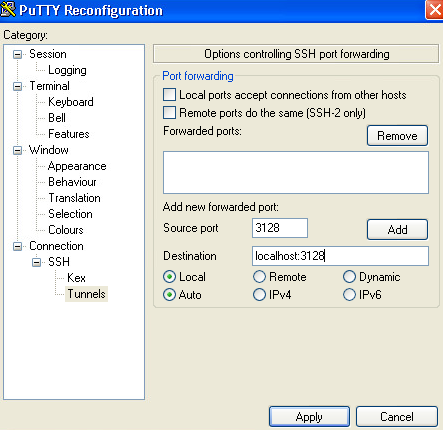 Vyberte Connection - SSH - Tunnels. Do pole Source port vyplňte 3128, do pole Destination vyplňte localhost:3128 a stiskněte tlačítko Add. Poté stiskněte tlačítko Apply.