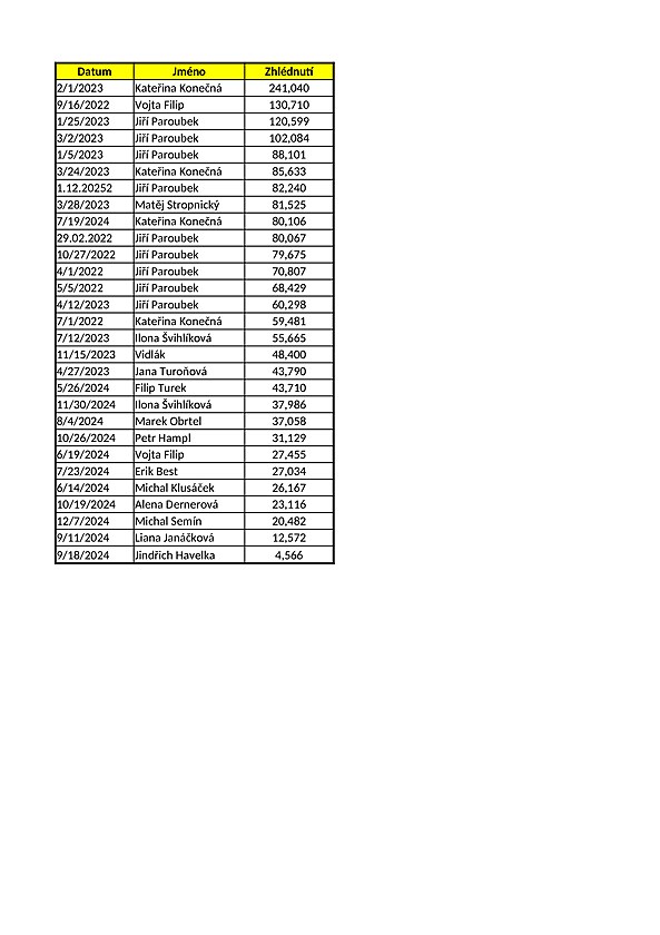 Příloha: Data pořadů a počet shlédnutí jednotlivých diskutérů v TV J. Bobošíkové