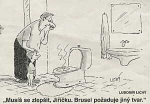 - Tak takhle my si tady v Evropě žijeme. A zatímco parlament, který není parlamentem, se na trase Brusel – Štrasburk stěhuje tam a zpět nikoli nepodobný bordelu na kolečkách, stát, který není státem, pomalu, ale jistě utahuje šrouby. Takže už máme dokonce i normy na splachování záchodů.