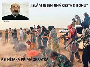 Ovšem ránu Hate Free sluníčkářům udělil britský ministerský předseda. Islamismus je jako fašismus, řekl Cameron a zavelel k boji. Představil pětiletý akční plán boje s islámským fundamentalismem. Radikalizace muslimů je podle něj "jed společnosti". Klidně to může být naprostá náboženská tolerance. Ale respektovat to musejí i nově příchozí. "Extrémní ideologie Islámského státu je založena na stejně netolerantních ideách diskriminace, sektářství a segregace. Jako ta, jež vedla ke vzestupu Adolfa Hitlera," řekl dále David Cameron. Tahle skupina, to není žádné průkopnické hnutí, to je tlupa, která vyhazuje lidi z oken budov a upaluje je zaživa. Je to zlá, brutální a odporná existence," dodal Cameron. Jasná řeč. Oproti tomu u nás máme onačejší borce. Například takový kněz s pochybným svěcením Halík.