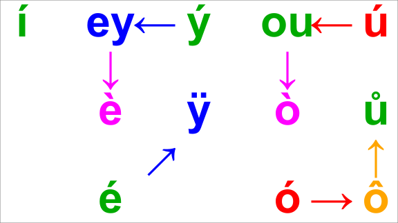 Nakonec nám zbývají ještě hanácké monoftongizované nové dlouhé samohlásky, které by bylo lépe psát s jiným diakritickým znaménkem než staré é ó. V úvahu připadá makron (ē ō) nebo grave (è è), zatímco cirkumflex použít nelze, protože už je použit v jiném významu jakožto slovenský vokáň. Nevýhodou makronu je, že se nevyskytuje na obvyklé české klávesnici, zatímco grave je AltGr7. (Tečka nad písmenem je AltGr8 a dá se použít i na výrobu toho beztečkového ı z normálního i.)