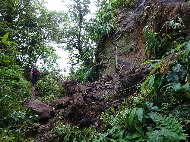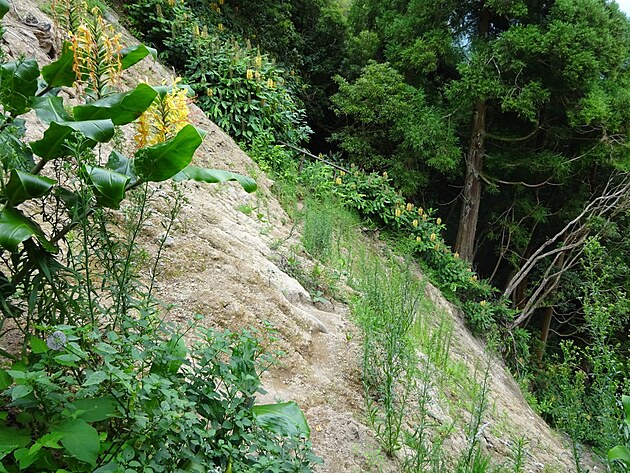Kde se vzalo, tu se vzalo, další pletivo přes cestu nás čeká. Brzy je nám vše jasné. Přicházíme ke svahu, který strhl prudký déšť. Zajímavý pohled dolů. Opatrně jdeme na druhou stranu a k jezeru se raději nedíváme. Byla by to zajímavá skluzavka, ale s nezajímavým koncem.