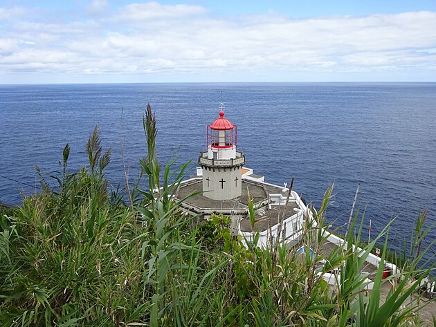 Krásný maják Ponta do Arnel před městečkem Nordeste. Vypadá to, že v něm bydlí nějaká rodina, jelikož právě vyndávají nákup z auta. Asi strážci majáku.