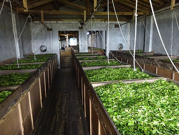 Na půdě se suší zelené rostlinky odrůdy Camelia sinensis.