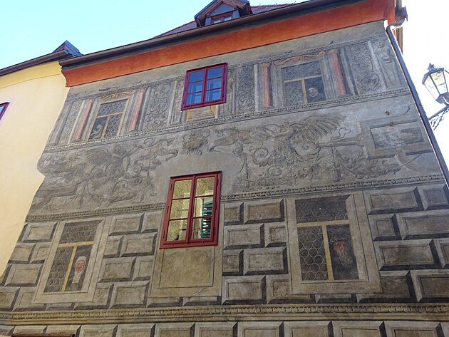 V Českém Krumlově nás přivítalo hezké, slunečné počasí. Najít náměstíčko Na Louži však nebyl problém. Vydali jsme se tam na prohlídku zajímavých fasád domů. Je jich sice více, ale jeden zmíním určitě. Průčelí domu č.p. 54 do Široké ulice zdobí zajímavě malovaná okna, z nichž vyhlížejí „obyvatelé“ domu a malá opička. Zda tam skutečně bydleli nebo se jedná o hříčku renesančních malířů, není známo.