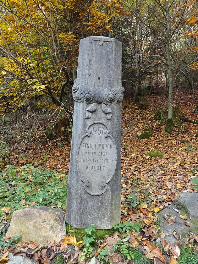 Určitě zajímavé věci, ale já jsem hledal něco jiného. A nebylo to vůbec jednoduché. Jak jsem již napsal, zdejší romantické údolí se stalo inspirací Aloisi Jiráskovi k povídce „V Pekle“. K jejímu obsahu se váže i „Ženichův hrob“. Na mapě ani na informační tabuli však uveden nebyl. V restauraci personál krčil rameny, že nic takového neslyšel. Rodinka, která se procházela venku a tvrdila, že to tady zná, jako své boty, také byla překvapena, co si to vymýšlím. Až musela zasáhnout vyšší moc - moje chytrá žena, která mi poradila, abych zkusil nějakého místního chataře. U prvního jsem sice nepochodil, ale druhý byl pro mě výhrou: „Půjdeš asi 300 metrů po vyšlapané pěšince, pak kousek nahoru a zase dolů a tam to uvidíš.“