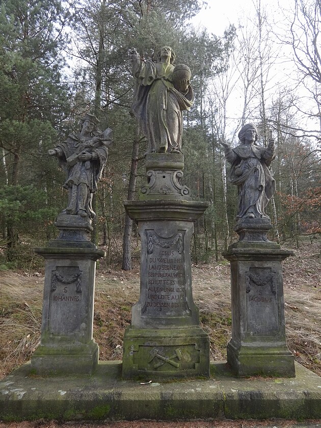 Poslední loučivý pohled a poté opouštím toto kouzelné místo. Napadá mě pohádka o živé a mrtvé vodě. Mrtvá voda, která by měla být léčivá na ekzémy, je pode mnou a ta živá? Nezbývá než hledat. Místo ní ale nacházím nedaleko jedno zajímavé pískovcové sousoší. Představuje Ježíše Krista, sv. Jana Nepomuckého a sv. Jakuba staršího. Nechal je tu postavit majitel dolů v roce 1814 na počest dvou horníků, kteří v dole zahynuli. Pozdně barokní památka měla také ochraňovat ostatní horníky z nedalekého dolu před neštěstím.