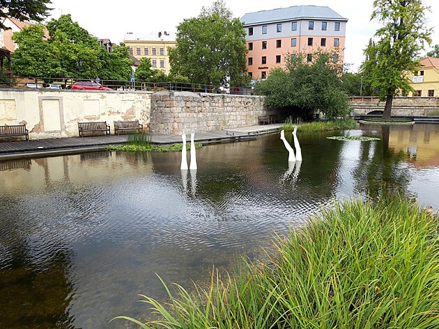 Na březích jsou stromy, barevné plastiky a ve vodě akvabely. Možná ty bílé nožky patří obyčejným plavkyním nebo plavcům, kteří se zde koupou již od roku 2019, kdy do Plzně zavítal sochařský festival Sculpture Line. Kdo byl předlohou ví asi jenom jejich autor.