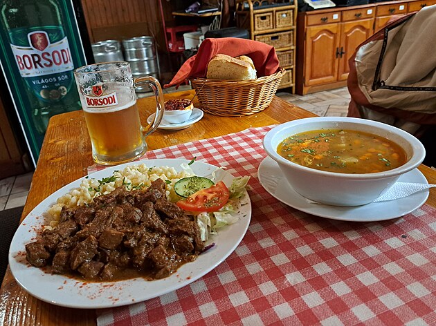 Řádně zrelaxováni jdeme na večeři. Objevujeme restauraci nabízející maďarskou klasiku, dobrou domluvu i ochotný personál. Něco takového při našich cestách vždy hledáme.