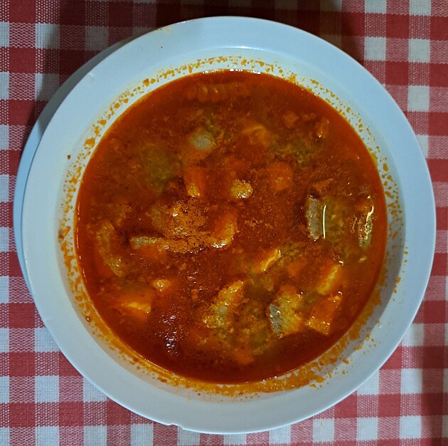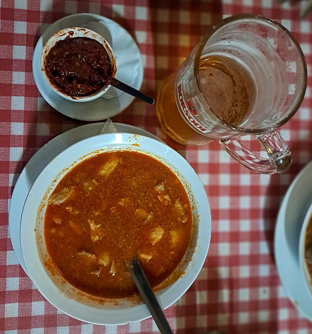 Halászlé, maďarská rybí polévka, charakteristická pro zdejší kuchyň. Výborná záležitost.