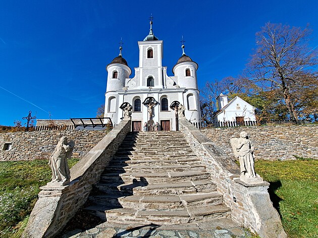 Schody vedoucí ke kostelu, dvě andělské postavy a sochy svatých.
