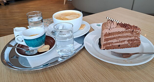 Na první pohled má tato zámecká kavárna své kouzlo, neopakovatelnou atmosféru a určitě by mohla vyprávět zajímavé příběhy. Na druhý pohled je to o kousek horší. Není pochyb o tom, že majitelem už není rod Esterházy. Chvíli po otevření nacházíme na všech stolech neskutečně špinavé ubrusy. Když uvažujeme o jejich otočení, zjišťujeme, že na druhé straně jsou ještě v horším stavu. Káva je sice chutná, ale slečna za pultem se opět neusmívá, a dokonce pije před námi vodu přímo z PET lahve. Původně jsme si chtěli říct o sklenici vody, ale toto naše přání raději přehodnocujeme.