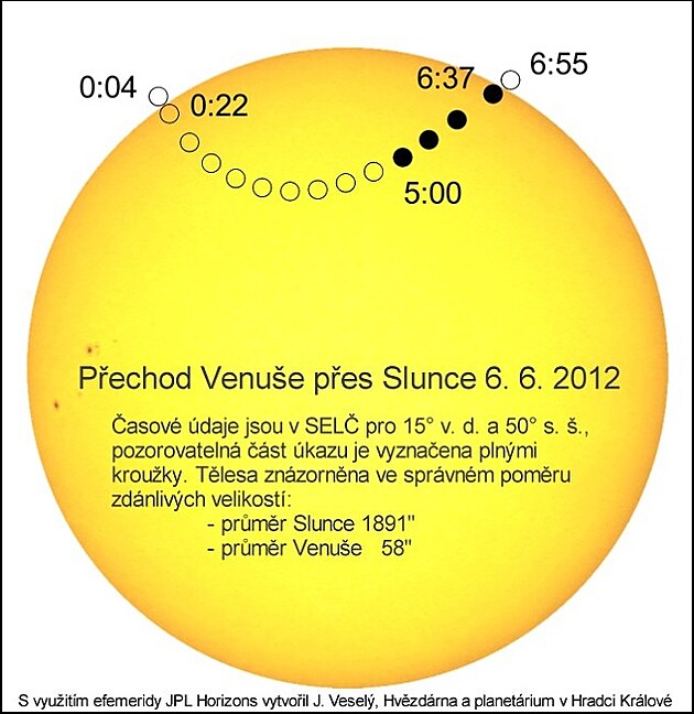 Pokud tedy o úkaz, který pro nás nemá další opakování, nechcete přijít, tak si ve středu 6.6.2012 musíte přivstat. Slunce v České republice vychází přibližně okolo 5 hodiny ranní (viz tabulka, kde je to pro jednotlivá místa rozepsáno přesněji). Určitě všechny lidové hvězdárny budou otevřené a budou nabízet možnost podívat se přes hvězdářské dalekohledy. Budete-li se dívat sami, tak je důležité si chránit zrak. Začouzené sklíčko v žádném případě nestačí. Dívat se na Slunce běžným a pro sluneční pozorování neupraveným dalekohledem je vyložený hazard. Jde sice o vzácný úkaz, ale jistě nestojí za to, aby byl tím posledním, co člověk v životě uvidí. Proto spíše doporučuji navštívit ty hvězdárny, které jsou na pozorování Slunce připravené a budete to mít i s výkladem. A nakonec tu Venuši mnohem lépe uvidíte a možná i s nějakou sluneční skvrnou na povrchu naší mateřské hvězdy.