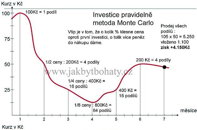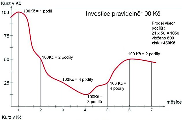 A teď si představte, že máte peněz víc a chcete hrát hru. Když cena padá, vezmu poslední nejvyšší a vypočítám kolikrát je menší (například 0,85). Do investice pak dám převrácenou hodnotu v penězích (1/0,85=1,18). Jednoduše, cena klesne ze 100Kč na 85Kč za podíl. Tak já dám do investice ne 100Kč, jak jsem zvyklý, ale 118Kč. Nakoupím tím víc podílů.