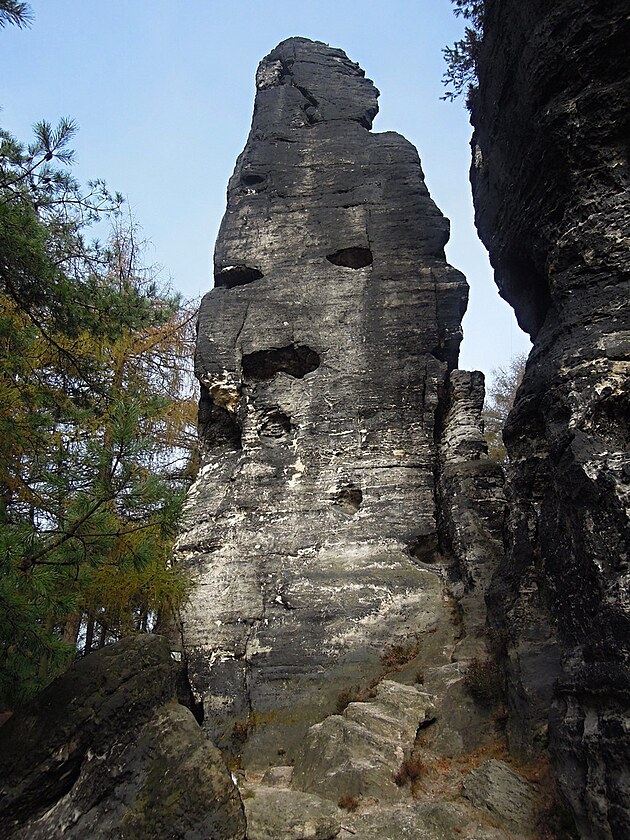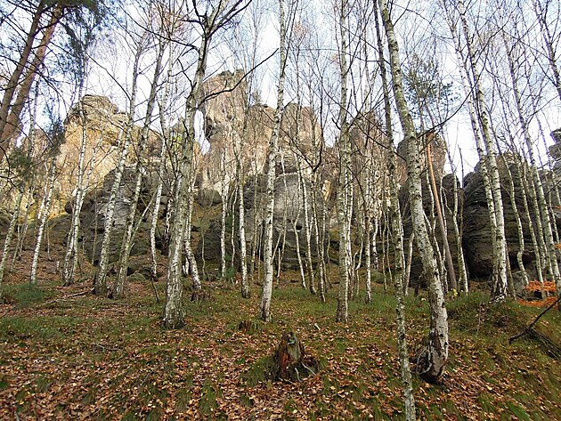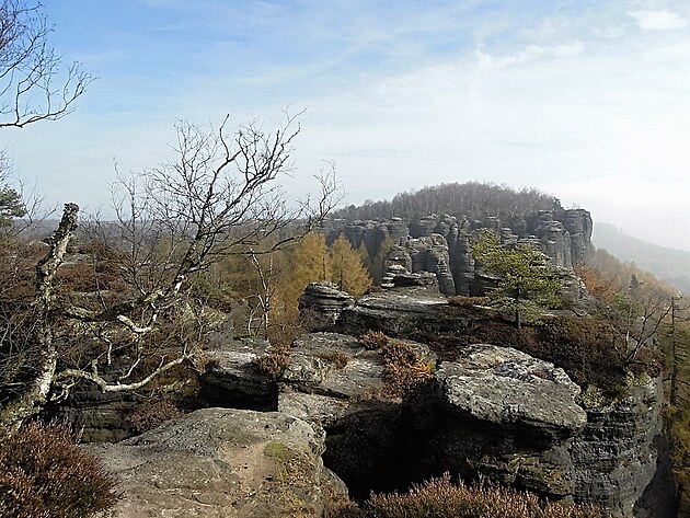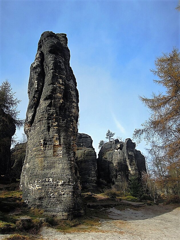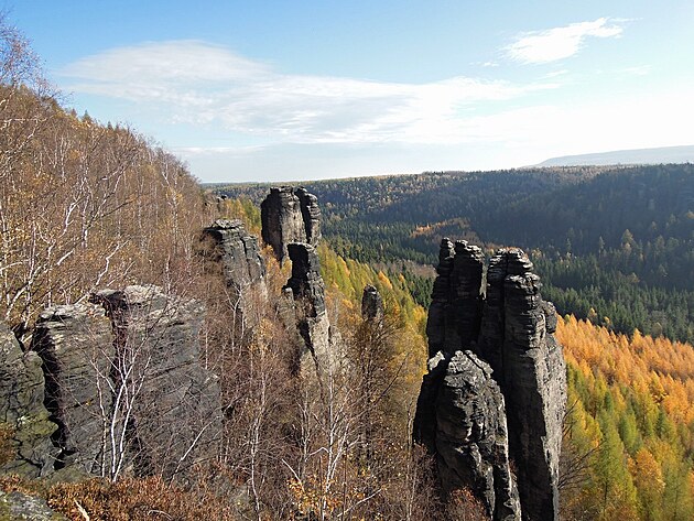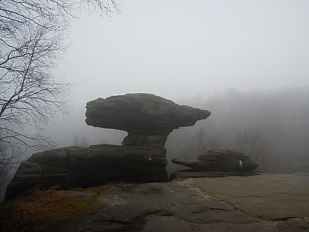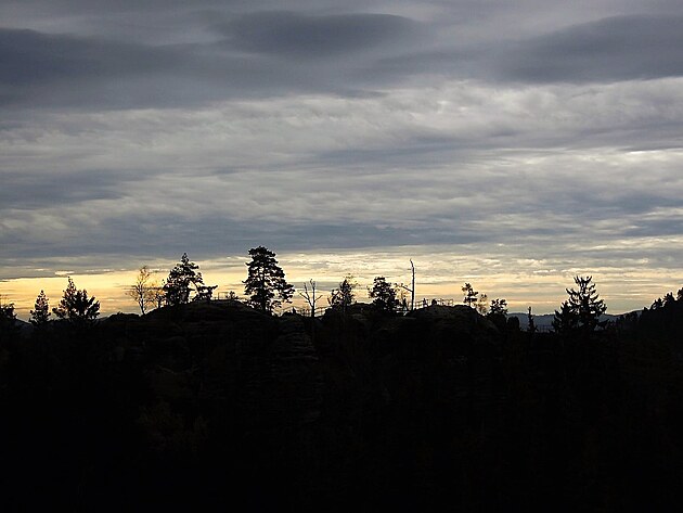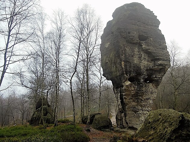 Ráno je oproti očekávání poměrně chladné a co hůř, je mlha. Doufáme, že se počasí umoudří, abychom si mohli užít budoucích výhledů a vydáváme se směrem do Tiských stěn. Nejprve procházíme Ostrovské skály alias Volské kameny, což je miniaturní skalní městečko, tvořené nízkými pískovcovými skalami. Cestu si zpestřujeme hledáním skal, pojmenovaných jako Obr, Císař, Orel nebo Popravčí kámen.