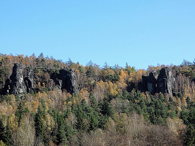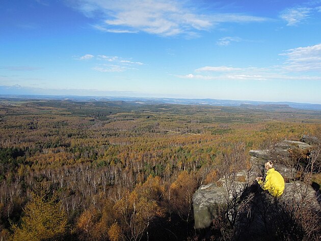 Asi po hodině chůze, jsme u vchodu do Tiských stěn. V pokladně je úchvatná dáma, která nás baví svými znalostmi skal, předkládá jednu historku za druhou a skončí popisem jejího vztahu k prezidentu republiky. Je príma vidět, jak někoho práce baví. S radostí platíme a vydáváme se na okruhy do Malých a Velkých Tiských stěn. Jsou mnohem komornější, než například Prachovské skály , ale nic jim to neubírá na jejich zajímavosti, ba naopak. Návštěvník obkrouží asi 70 skalních útvarů, které připomínají obličeje nebo zvířata, my našli Helmu, Triumfální bránu, Úl a Napoleonovu botu. Mezitím se mlha rozplynula a my nejsme ochuzeni o krásný výhled po okolí z jedné z mnoha vyhlídek.