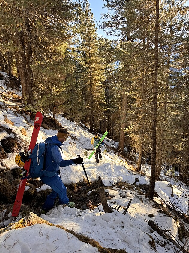 Ranní svítání odhaluje skutečný rozsah sněhové mizérie. Snad nám ty pochody „kamenolomy“ trochu vylepší náladu. Apky hlásí jasno a slunce. Přejíždíme kousek dál, proti proudu říčky Melach, na parkáč v Lüsens. Odtud už vyrážíme po pásech. Obavy se naplňují. Je to fakt bída. Málo sněhu, samý kámen a větve. Ve vyšších polohách, už nad lesem, se situace lepší a s výškovými metry je sněhu dokonce dost. Jen ta kvalita… přemrzlý sníh a totální krusta.