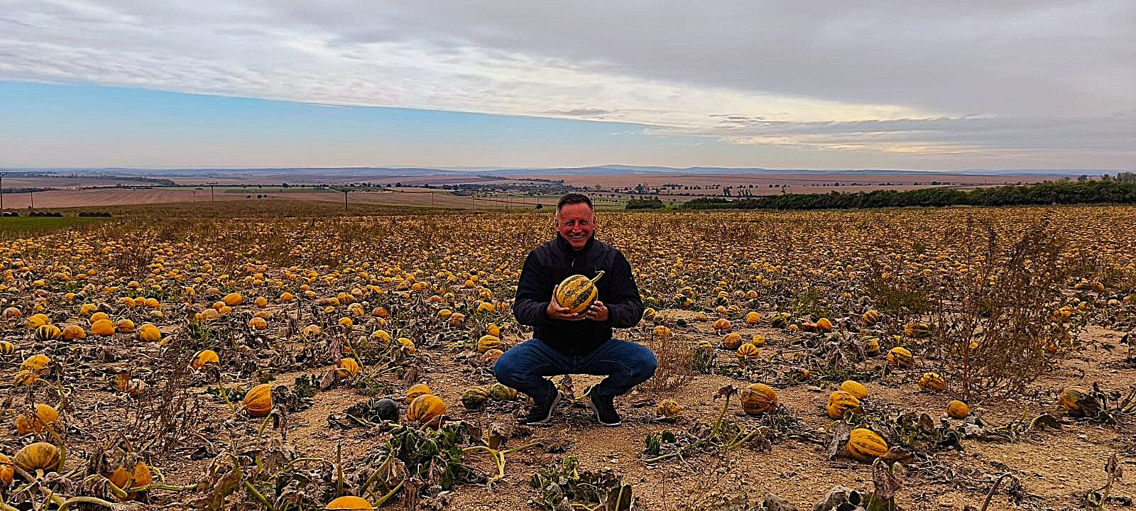 Vinař Karel Blahůšek na dýňovém poli ochotně pózuje jako pro média.