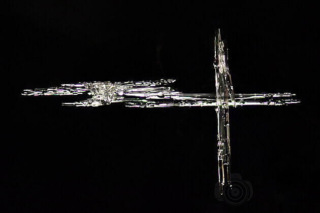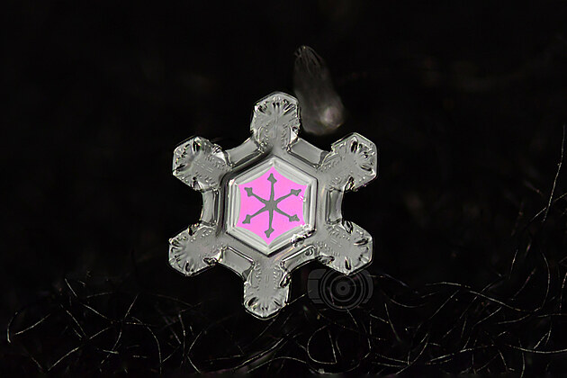 ... a lomem světla ve vzduchové bublině se může vločka „obarvit“: