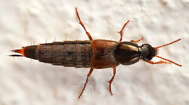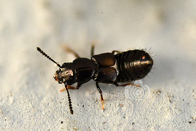 O něco menší je Aleochara bipustulata (starým českým názvem výslunník dvoutečný), kterého se nám konečně podařilo pořádně vyfotit. Předtím vždy buď prchal, zaujímal divnou pózu nebo nebylo možné se k němu dostatečně přiblížit: