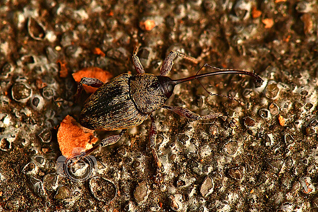 Žaludy teď ze stromů přímo prší, z čehož plynou pracovní rizika. Při focení nosatce žaludového to Jakub od přírodních projektilů docela schytal, kromě toho nosatec pořád prchal, takže záběr se příliš nepovedl, brouček se úplně ztrácí v podkladu: