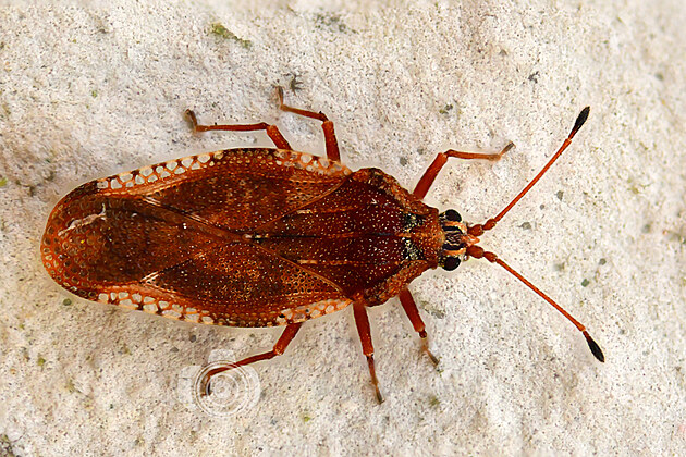 Ještě jedna ploštice – krásná síťnatka Physatocheila dumetorum, nápadná svým oranžovým zbarvením, které ji odlišuje od jiných druhů, nejčastěji krémově šedě zbarvených. Doma je na keřích porostlých mechem: