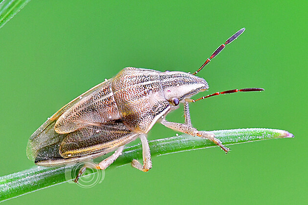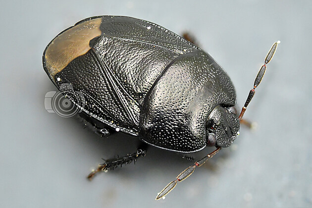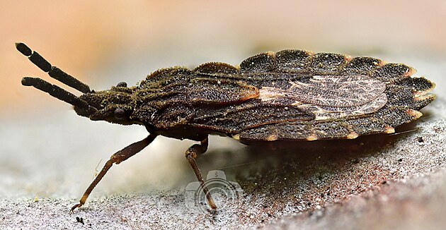 Poslední dnešní plošticí je podkornice Aradus betulinus. Několikrát už jsme ji ukázali vyfocenou shora, ale teprve takto v šikmém pohledu dobře vidíme její extrémně ploché tělo, které jí umožňuje bez problémů žít pod kůrou: