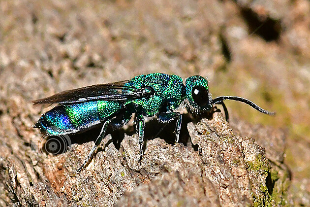Zlatěnka Chrysis fasciata je u nás poměrně vzácná. Vyhledává osluněná místa s odumřelým dřevem – naše modelka se jako třpytivý šperk usadila na padlém dubovém kmeni: