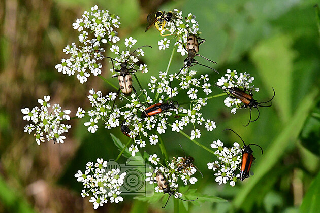 Úvodní foto by se mohlo jmenovat "Tesaříci na kolotoči". Do červena zbarvení jedinci jsou samice tesaříka černošpičkého, světlí brouci se skvrnami jsou zase tesaříci tesaříkovití: