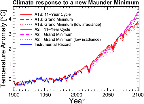 Často vzpomínané v této souvislosti je takzvané Maunderovo minimum, což bylo období nízké sluneční aktivity mezi léty 1645 a 1715, které se na severní polokouli krylo s "malou dobou ledovou" (ta probíhala až zhruba do roku 1850). V tomto případě navíc chladným podmínkám napomohlo období výrazně zvýšené vulkanické aktivity. Je možné, že by se něco takového stalo i dnes, kdyby se sluneční cykly přerušily na několik desítek let? Časopis New Scientist se právě tímto zabývá ve svém článku s výmluvným názvem "Nová doba ledová? S tím nepočítejte" . Upozorňuje na studii z loňského roku (Feulner & Rahmstorf 2010, pdf zde), ve které vědci zkoumali, jak by další takové Maunderovo minimum ovlivnilo klima na Zemi. Jejich závěr zněl takto: