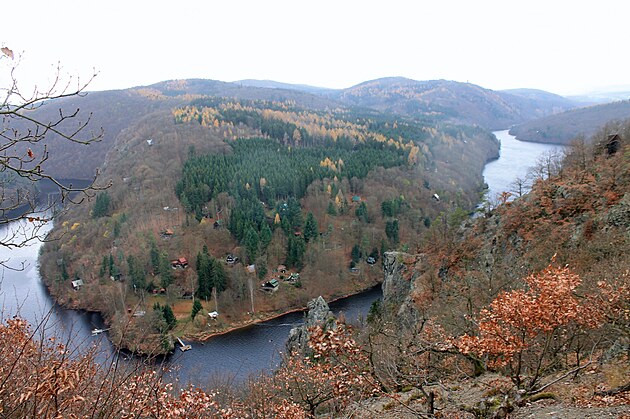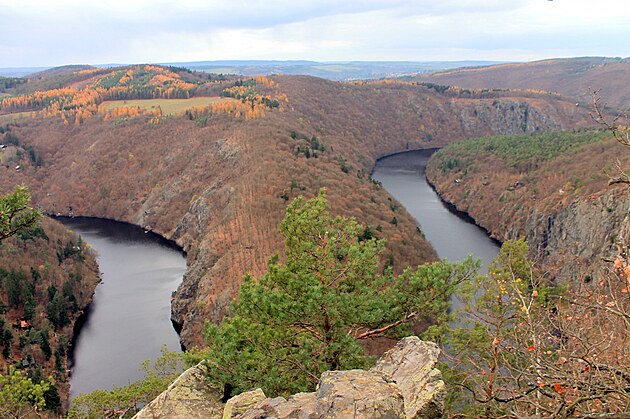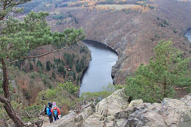 Ale pojďme se Šlapkou dál k vyhlídce Máj. Zatímco pohodlní automobilisté nasednou do svých vozů a dostanou se k ní po silnici přes Krňany do Teletína, kde mají k dispozici parkoviště a odkud je čeká jen pár set metrů pro jejich nohy jistě namáhavé chůze, my pokračujeme po žluté značce prudkým sešupem ke Krňanskému potoku. Dostaneme se k trampské osadě Proudy, odkud dlouhým mírným stoupáním dorazíme na další náhorní planinu před vyhlídkou Máj. Samotný Máj je ještě úžasnější než předchozí zastávka u Smetany, převýšení nad hladinou Vltavy zde činí skoro dvě stě padesát metrů, tedy čtyři Petřínské rozhledny nad sebou. Není divu, že fotografie z těchto míst lze spatřit ve stovkách téměř totožných variací na internetu.