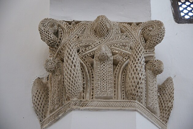 Třicet dva sloupů tohoto chrámu je vyrobeno z cihel pokrytých cementem a vápnem. Hlavní města, zdobená šiškami a svitky, naznačují vliv románského umění. Nad podkovovitými oblouky převládá abstraktní ornamentika v horizontálních vlysech, jejichž součástí jsou lišty s jemnými motivy vycházejícími z interakce linií a medailonů. Geometrické propletence tvořené čarami jsou almohadského původu.