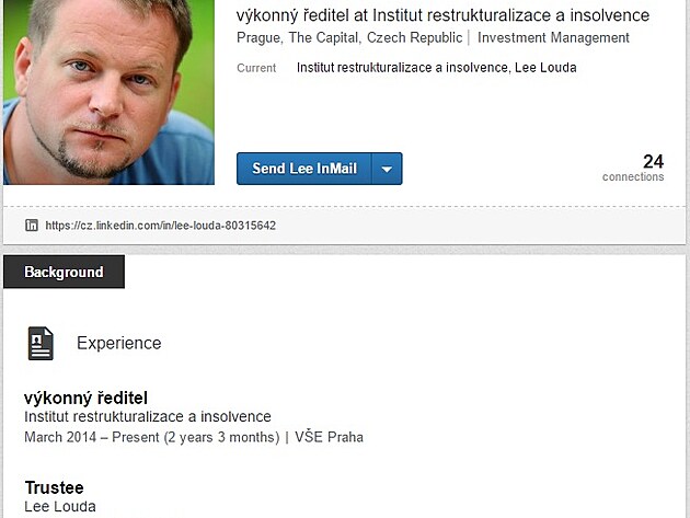 Když jsem se podíval do Obchodního rejstříku, zjistil jsem, že jméno pana Loudy je uvedeno u38 subjektů, většina samozřejmě v konkurzu, nebo likvidaci a v těch zbylých pan Louda figuruje jako standardní člen. Co mne však překvapuje je strohost profilu pana Loudy na profesní sociální síti LINKEDIN, kde se nedozvíte více, než je na obrázku níže.