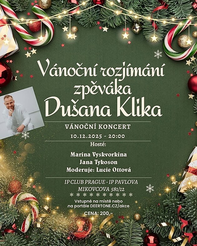 já a múj tým Vás srdečně zveme na moje první Vánoční rozjímání, které se koná 10.12.2025 od 20:00 v IP Clubu na IP Pavlova v Praze. Jsem popový a muzikálový zpěvák a začínal jsem u klasiky. Dříve jsem působil v Divadle města Ústí nad Labem a od září jsem na volné noze a zároveň externě zpívám v divadle F.X. Šaldy v Liberci. Na mém kocertě Zazní spoustu zajímavých vánočních i nevánočních skladeb - popových, muzikálových a šansonových, ale i klasického charakteru, které ale uslyšíte v podání mé milé kolegyně zpěvačky a operní divy Mariny Vyskvorkiny, která přijala mé pozvání a zazpívá si semnou na mém koncertě. V neposlední řadě přijala pozvání i další vzácná návštěva a to moje česko - švédská kamarádka a designérka Jana Tykoson, která si také semnou zazpívá a která pro zajímavost pochází právě z hudební rodiny skladetele Váši Příhody a její rodina má vazbu na jméno skladatele Gustava Mahlera. Meze se nekladou a možná uvidíte na pódiu i někoho dalšího, krom toho mezi diváky v hledišti zasednou i různí VIP hosté a umělci. To vše a mnohem více Vás čeká. Tak neváhejte a doražte!!!