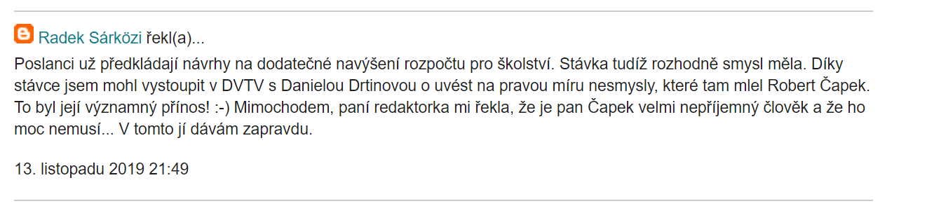 Další část masky byla odkryta stávkou učitelů. Proč vlastně učitelé stávkovali? Jako jeden ze dvou organizátorů, „prezident“ spolku Pedagogická komora Radek Sárközi o tom napsal článek. Tam se čtenář překvapeně dozví, že se nestávkovalo o odmítnutí „8% + 2%“ (jak to vyhlásily odbory), ani o snížení 15% na 10% (jak to pojali někteří učitelé samovolně), ale o „učitelé stávkovali především za kvalitní školství, lepší podmínky pro vzdělávání a budoucnost této země.“ Krásná slova! Ovšem na transparentech je nikdo neměl, na školách nevisely… myslíte si, že kdyby se stávkovalo za tyto velké věci, byla by účast škol pouhých 10%? Vypadá to, že si Radek Sárközi vymýšlí. Naštěstí víme, k čemu byla stávka jemu osobně. Sám o tom napsal (13. listopadu 2019 21:49): „Díky stávce jsem mohl vystoupit v DVTV s Danielou Drtinovou o uvést na pravou míru nesmysly, které tam mlel Robert Čapek. To byl její významný přínos!“
