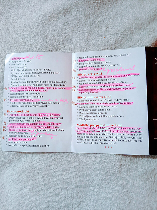 V neděli ve 14:11 (zpověď začínala ve 14:00) jsem se rozhodla pro poctivou přípravu, vzala jsem si růžový Highlighter a pečlivě jsem si podtrhla všechny důležité informace o svaté zpovědi.