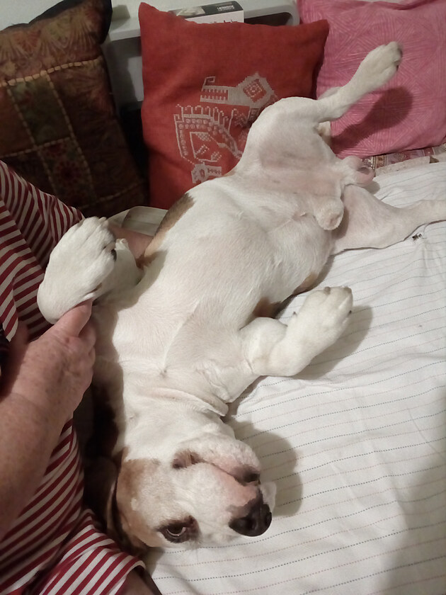 My dva se milujeme nehynoucí láskou. Bambusek má totiž povahu jako naše nezapomenutelná jezevčice Frida, co už je pár let ve psím nebi. A tak ho chápu. Jsem k jeho launům tolerantní, a to chlapi uměj ocenit. K tomu všemu se Bambů rád mazlí. I když je rozespalý. Pak je ve své dvacetikilové mohutnosti dokonale vláčný a neuvěřitelně roztomilý.
