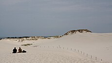Lebské duny v Polsku, pohyblivé pískové duny vysoké až 40 metrů, UNESCO. Poušť je plná písku, ale ne lidí. Z vrcholu dun je vidět divoké Baltské moře.